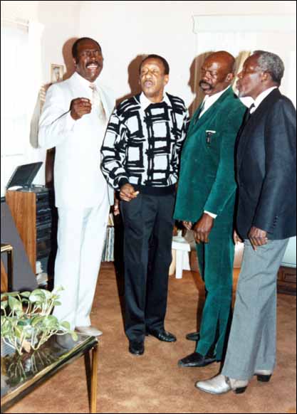 | The Crowns practice for a 1990 DWS show. Left-to-right: Arthur Lee Maye, Johnny Coleman, John "Sunshine" Favors and Charles Colbert. |