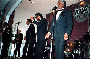 The opening act was Jewel Akens with a great trio of singers behind him--Isaac Hurley, Rene Beard (formerly of The Jayhawks of "Stranded in the Jungle" fame), and Al Martin. Jewel presented a mix of Sam Cooke, Johnny Taylor and Jesse Belvin tunes. From Cooke's songbook he performed "Havin' a Party," "Just For You" and "Touch the Hem of His Garment" (from Cooke's Soul Stirrers period), along with Taylor's "Stand By Me, Father," which sounded like a Sam Cooke record when it first came out on Cooke's SAR label 40 years ago. From his Jesse Belvin bag, Jewel ably pulled out "One Little Blessing" and "Heartless," which RCA never got around to releasing until 1974, but which has since become a big favorite among Belvinites. To please his own fans, Jewel also sang his 1965 pop hit, "Birds and the Bees" (as his opener for the second show, to get the song out of the way) and the fantastic "Pleading For You Love," which he originally recorded with The Four Dots on Freedom Records in 1958. Though Jewel and the guys started off a little shaky in the first set, they quickly got on track and delivered a powerful show.