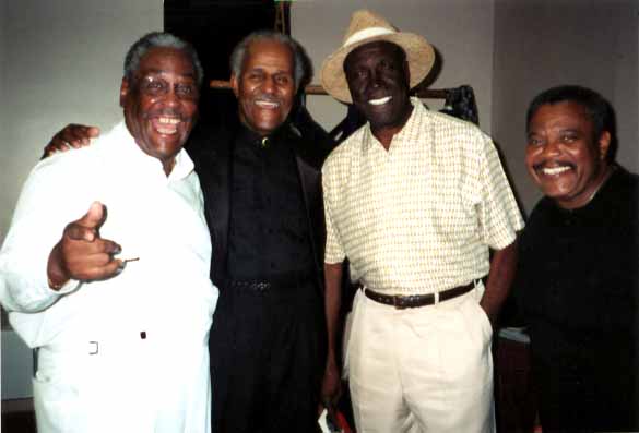 | Arthur Lee Maye (hat) visits with Bobby, Waldo and Milton (of The Solitaires and The Wrens) backstage |