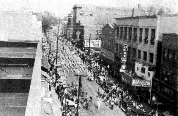 Looking north toward Eighth, you can see the Parker Theater and Cox's Department Store.