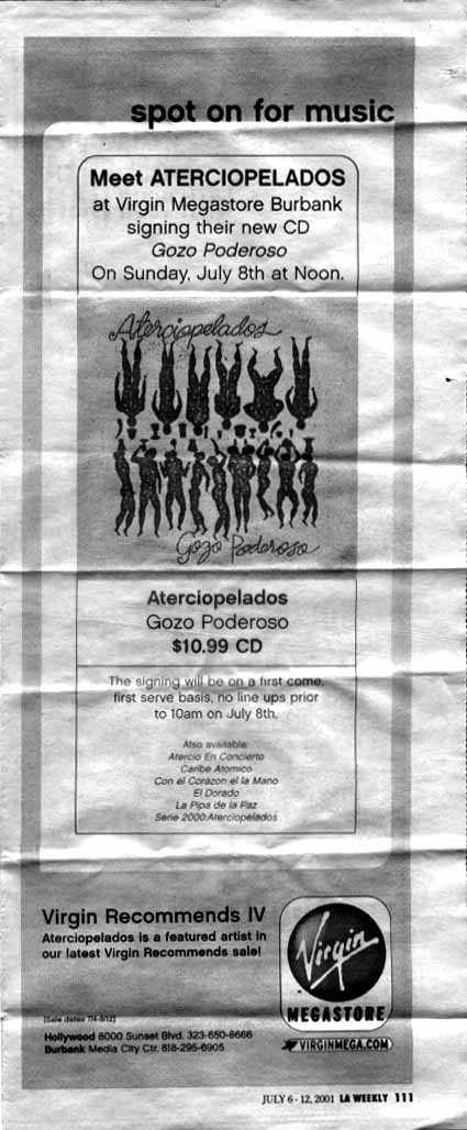 ATERCIOPELADOS IN LOS ANGELES 2001 newspaper ad for CD-signing at Virgin Megastore in Burbank