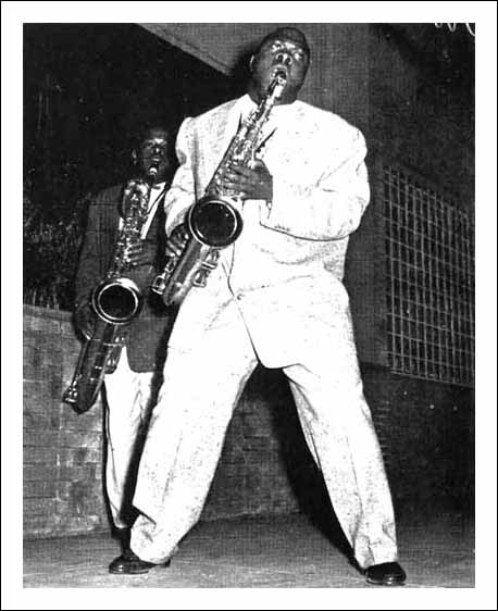 Big Jay walks and blows outside the Club Oasis in Los Angeles