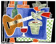 Collectors of music-related art should check our Diz Disley page. Although the British musician is known in the jazz world for his guitar work with Stefan Grapelli, he has also had a long stint as illustrator for the music weekly Melody Maker, and in recent years has had a second career with his full-color pieces.