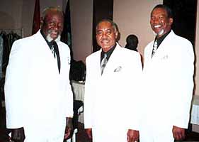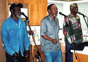 During rehearsal, several days before the 5/5/2001 show, Jacks/Cadets Randy Jones (right), Pete Foxx and Willie Davis harmonize. |