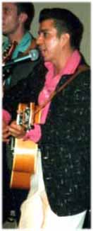 Emcee Eugene Maye greets the Dunn Brothers, James (left) and Cliff (right), of The Dreamlovers Pep Torres Then the audience got a surprise when the next act, which was added to the lineup only two weeks earlier, took the stage. Pep Torres and his band (guitarist Joel Morin, standup bassist Tony Macias and drummer Eric Heinly) are definitely not doo-wop, though they did start off their set in harmony with "Tell Me Why." But since this was Cinco de Mayo, the young entertainer and his rockabilly/R&B outfit gave the crowd a little taste of East L.A., including a five-song tribute to Ritchie Valens that included "Come On Let's Go," "Framed," "Hi-Tone," "That's My Little Suzie" and "Donna." Pep also performed several songs in Spanish, including "Girl of My Best Friend" and "Tallahassee Lassie."