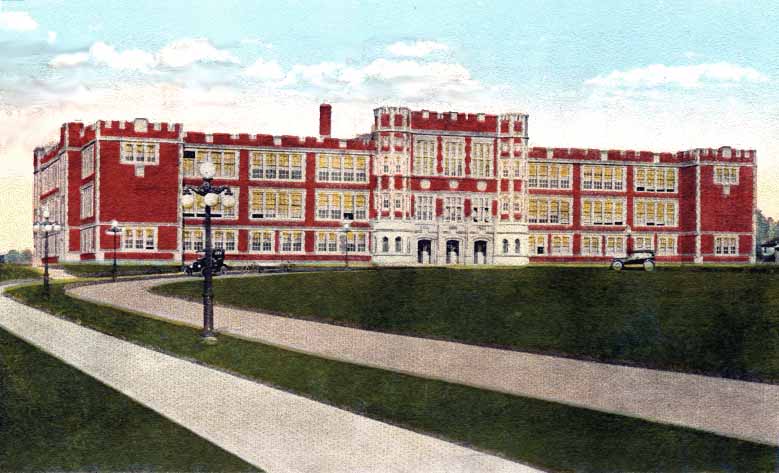 Parkersburg's current Tudor-style high school was built in 1917 (seen here the following year) on its own large campus at Dudley Avenue between 20th and 23rd Streets. |