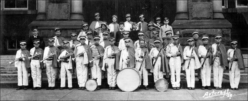 The Washington Jr. High School band stands in front of the school's main doors in 1929.