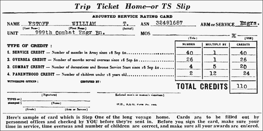 While writing this letter, I am listening to a program starring Joan Davis. We have our own broadcasting station right here on the base. Every night from 9:00 to 10:30 P.M., we have our own all-request program. Various outfits telephone in their requests. All of the latest records they seem to have, in addition to the old favorites. We have a radio to which all of us are hooked up to - with earphones. Enclosed is a copy of the Squadron Pulse. [This newsletter is no longer in the envelope. However, all of the Squadron Pulse newsletters have been collected from other sources and can be found on the Squadron Pulse page. - Ed.] Also, a typical copy of the "point system" card that I had to fill out for the Army's new brainstorm for boosting morale. [No longer in the envelope. See below for samples that were found elsewhere. For an in-depth explanation, see the Wikipedia article about the Adjusted Service Rating Score and the article "The Points Were All That Mattered: The US Army's Demobilization After World War II" at nationalww2museum.org. - Ed.]