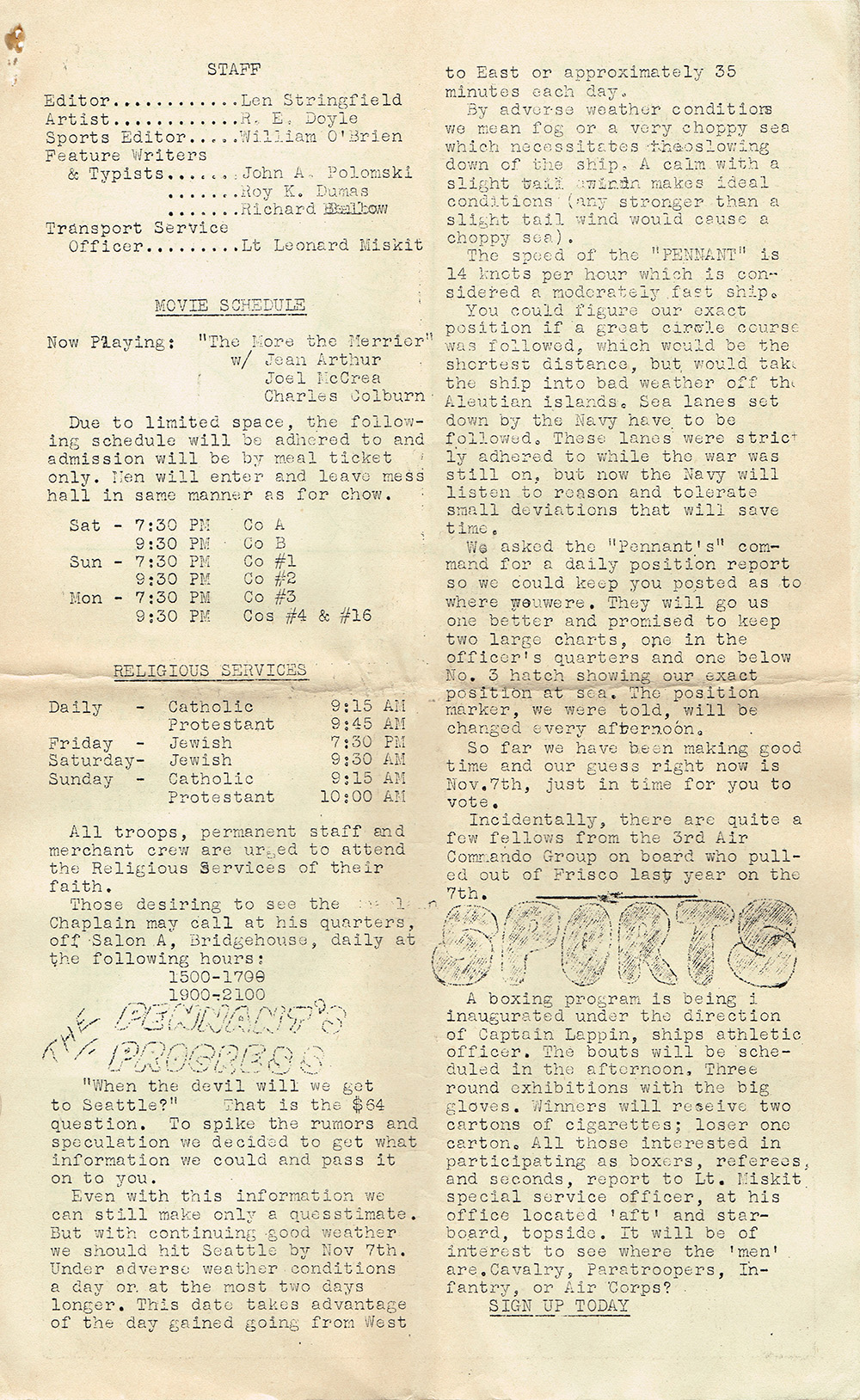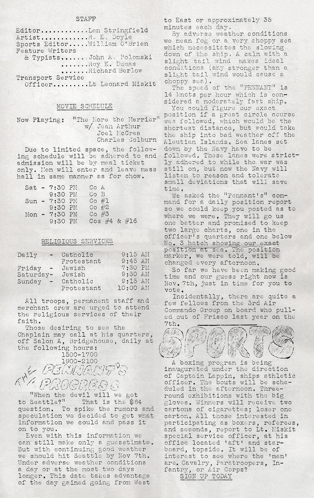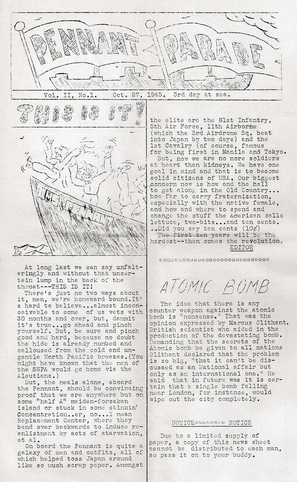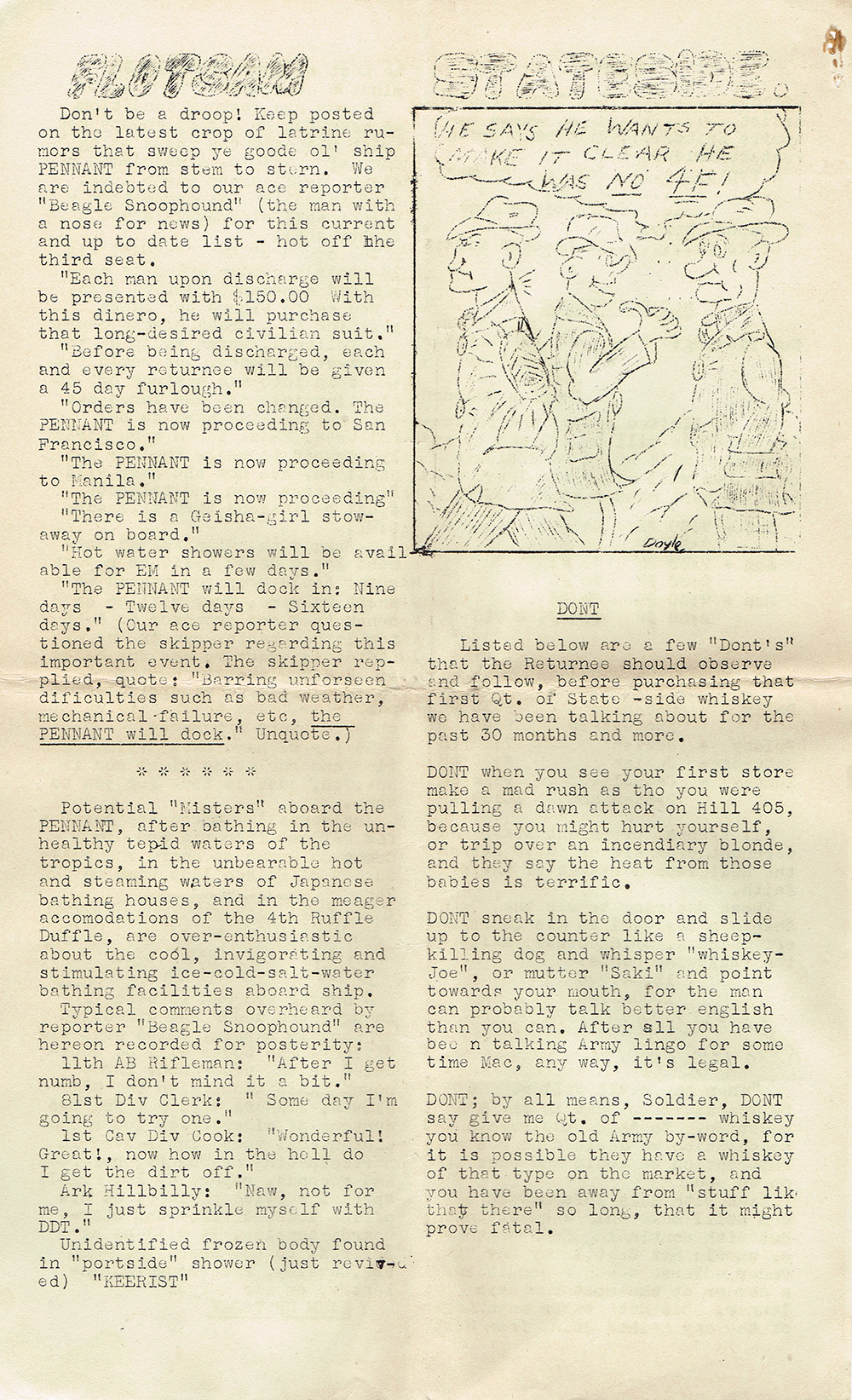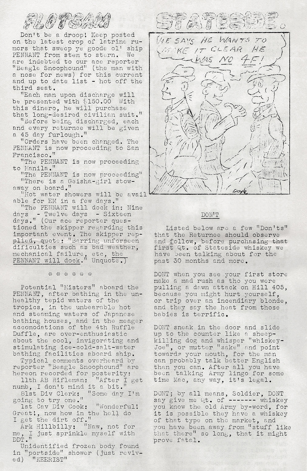 bathing facilities aboard ship. ["4th Ruffle Duffle" probably refers to the Fourth Replacement Depot, which is mentioned in Pennant Parade issue number 4. A ruffle duffle bag is a sort of travel bag. The phrase “ruffle duffle” (or “ruffle-duffle”) was also used to indicate some kind of confusion or mix-up. - Ed.]