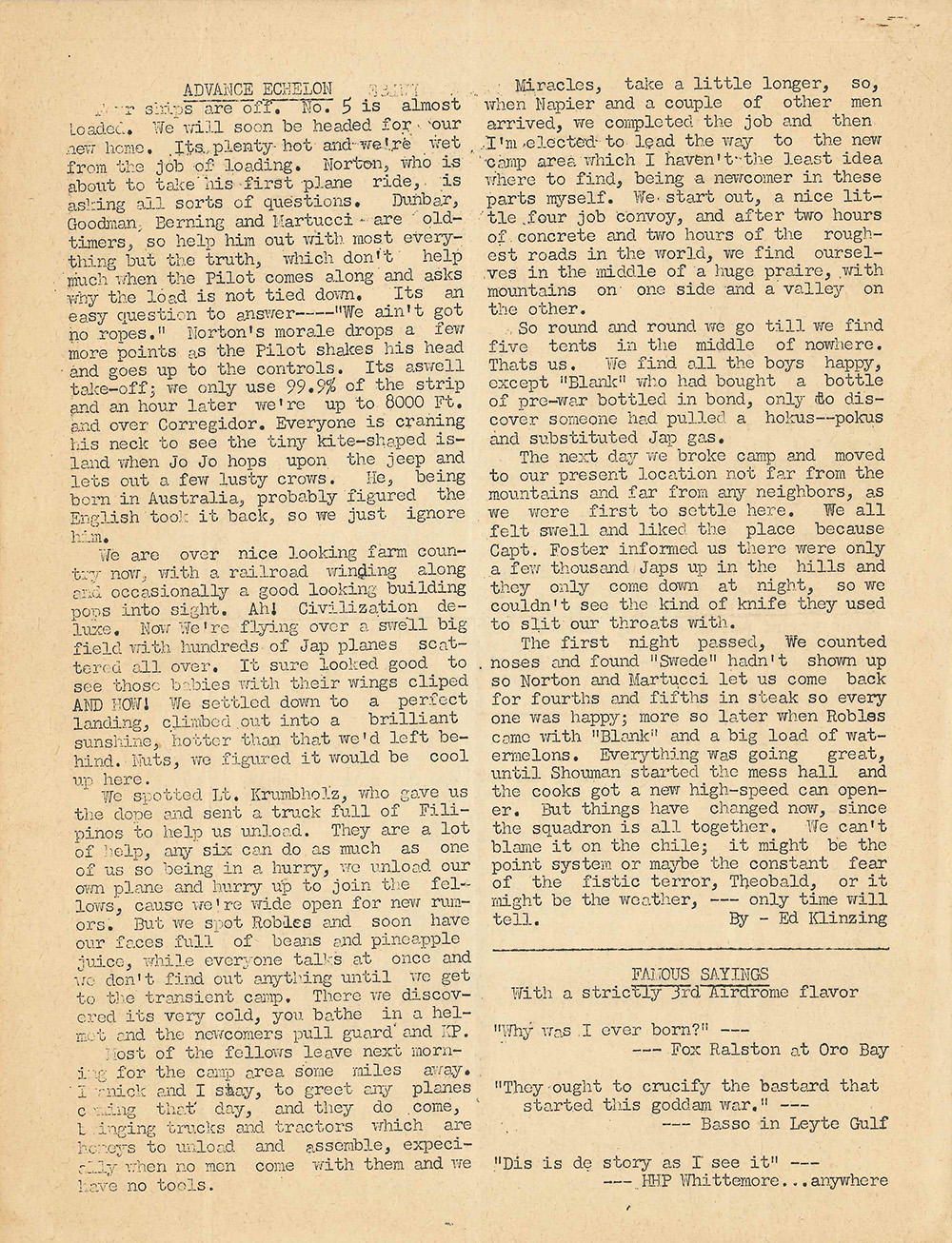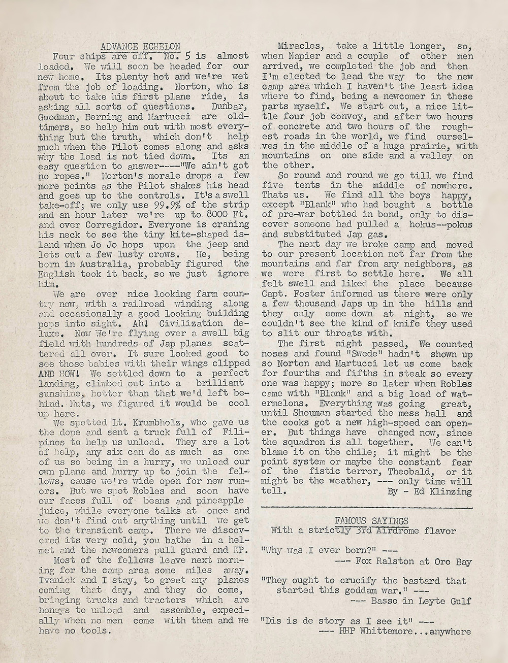 We spotted Lt. Krumbholz, who gave us the dope and sent a truck full of Filipinos to help us unload. They are a lot of help, any six can do as much as one of us; so being in a hurry, we unload our own plane and hurry up to join the fellows, cause we’re wide open for new rumors. But we spot Robles [a cook - Ed.] and soon have our faces full of beans and pineapple juice, everyone talks at once and we don’t find out anything until we get to the transient camp. There we discovered it’s very cold, you bathe in a helmet and the newcomers pull guard and KP.