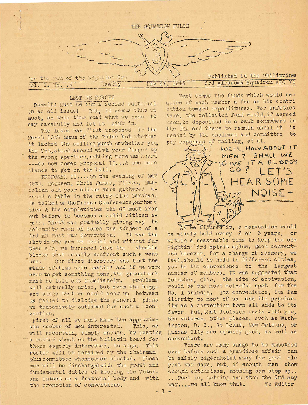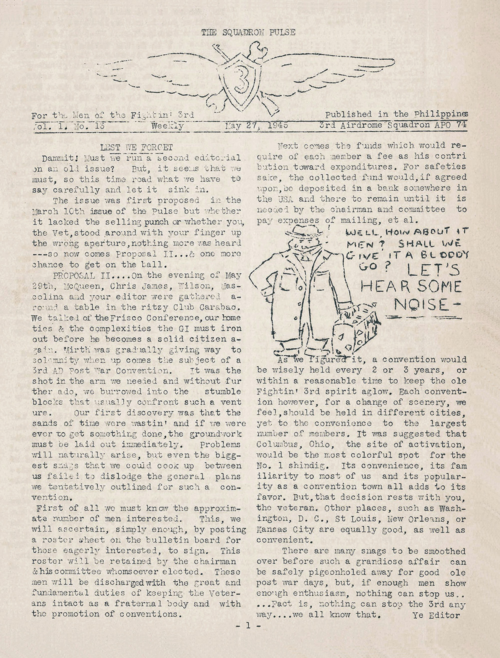 PROPOSAL II....On the evening of May 29th, McQueen, Chris James, Wilson, Mascolina and your editor were gathered around a table in the ritzy Club Carabao. We talked of the Frisco Conference, our home ties & the complexities the GI must iron out before he becomes a solid citizen again. Mirth was gradually giving way to the subject of a 3rd AD [Airdrome - Ed.] Postwar Convention. It was the shot in the arm we needed and without further ado, burrowed into the stumble blocks that usually confront such a venture. Our first discovery was that the sands of time were wastin’ and if we were ever to get something done, the groundwork must be laid out immediately. Problems will naturally arise, but even the biggest snags that we could cook up between us failed to dislodge the plans we tentatively outlined for such a convention.