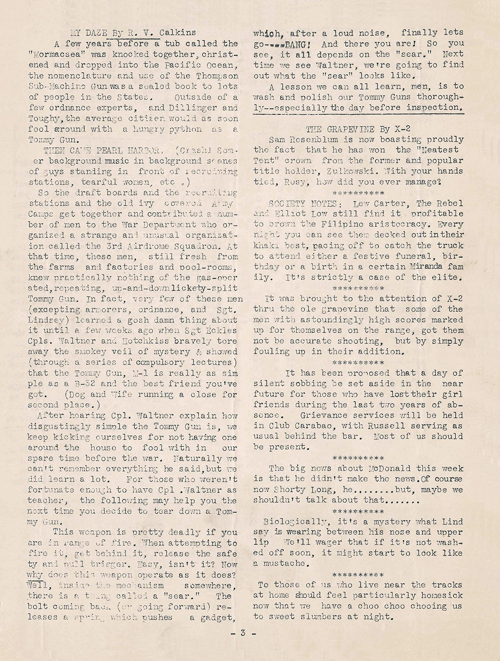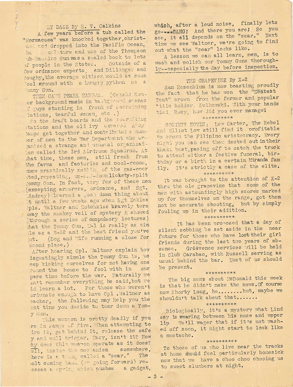 So the draft boards and the recruiting stations and the old ivy covered Army Camps get together and contributed a number of men to the War Department who organized a strange and unusual organization called the 3rd Airdrome Squadron. At that time, these men, still fresh from the farms and factories and poolrooms, knew practically nothing of the gas-operated, repeating up-and-down lickety-split Tommy Gun. In fact, very few of these men (excepting armorers, ordnance, and Sgt. Lindsey) learned a gosh damn thing about it until a few weeks ago when Sgt Eckles, Cpls. Waltner and Hotchkiss bravely tore away the smokey veil of mystery & showed (through a series of compulsory lectures) that the Tommy Gun, M-1 is really as simple as a B-32 and the best friend you’ve got. (Dog and wife running a close for second place.)