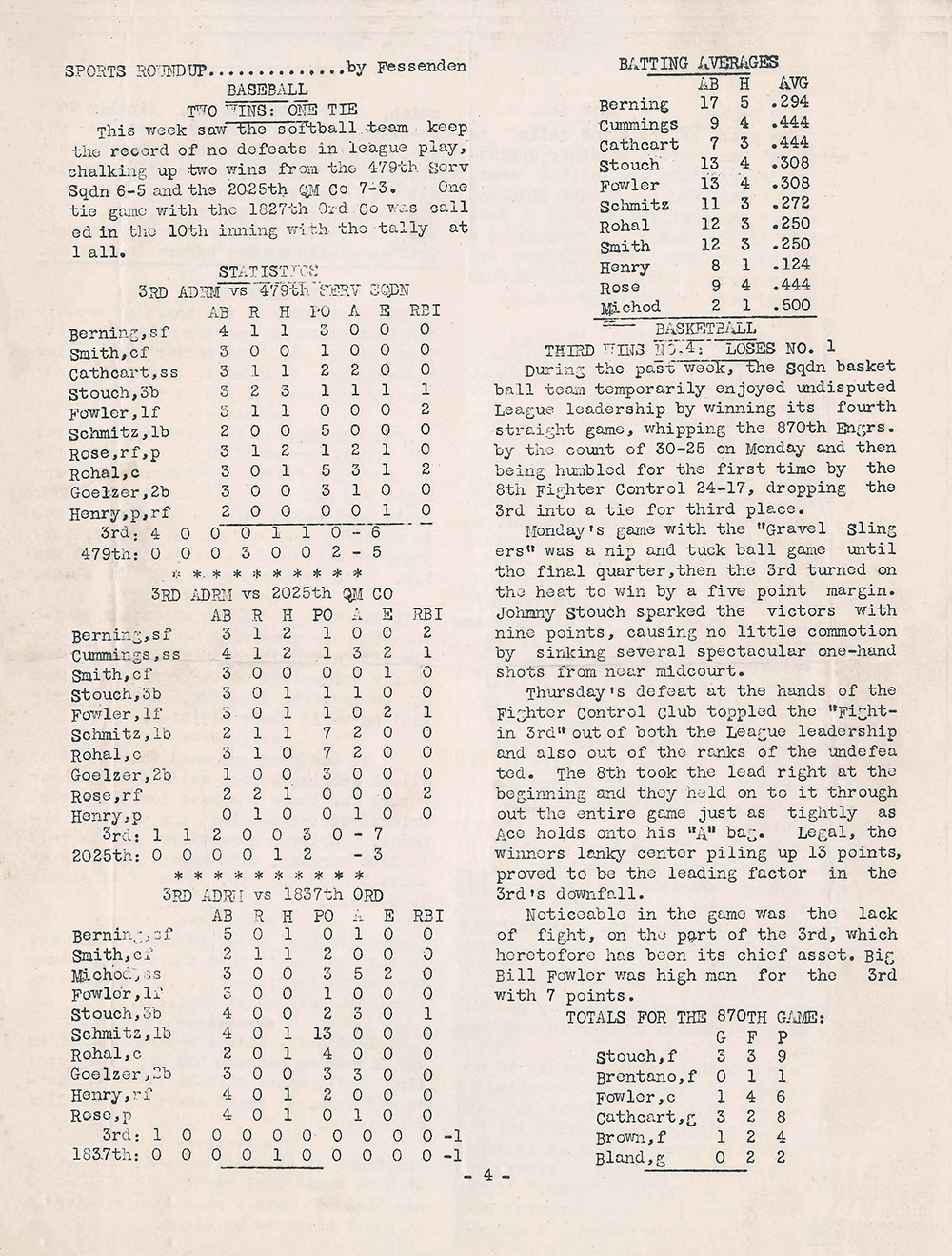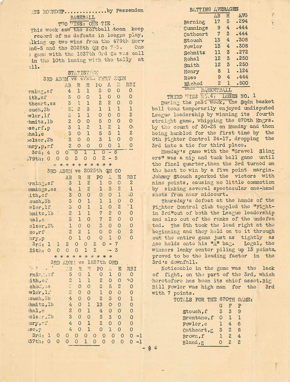 Noticeable in the game was the lack of fight on the part of the 3rd, which heretofore has been its chief asset. Big Bill Fowler was high man for the 3rd with 7 points.