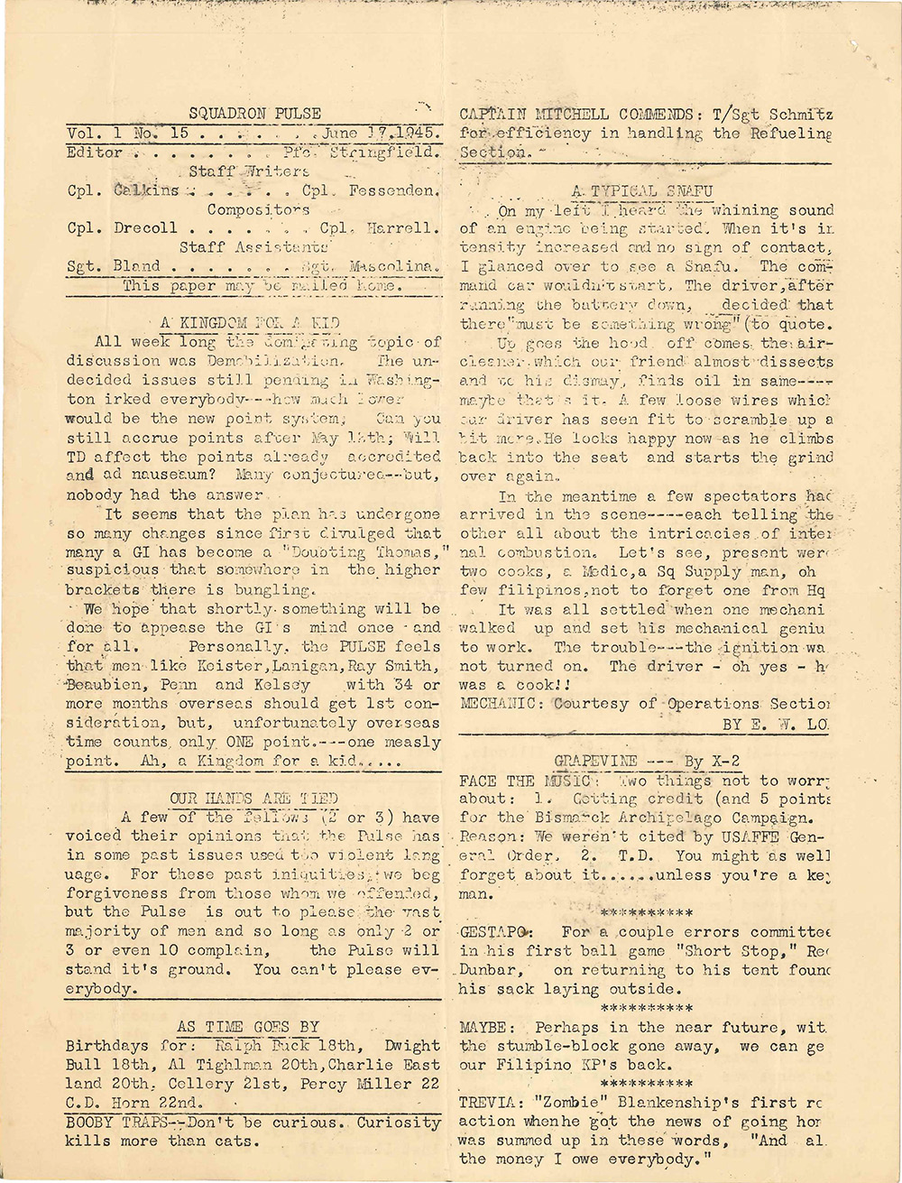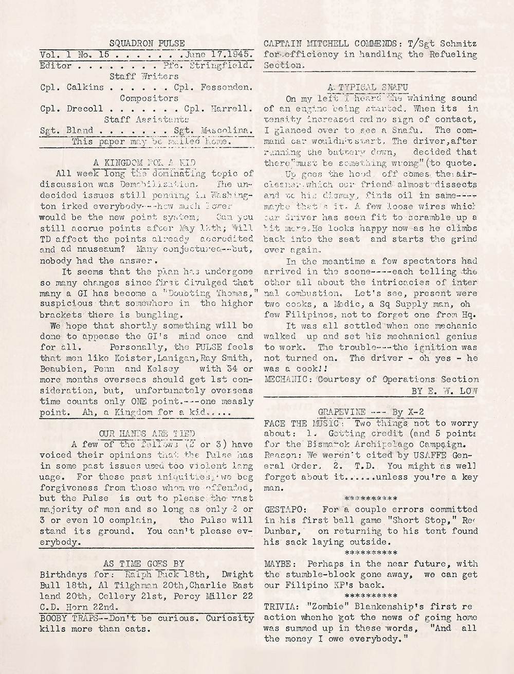 We hope that shortly something will be done to appease the GI’s mind once and for all. Personally, the PULSE feels that men like Keister, Lanigan, Ray Smith, Beaubien, Penn and Kelsey with 34 or more months overseas should get 1st consideration, but, unfortunately overseas time counts only ONE point---one measly point. [This is not quite accurate. While each month of overseas duty counted as one point, soldiers also got one point for each month in the service overall. So a month overseas meant two points. - Ed.] Ah, a Kingdom for a kid..... [Under the point system, which determined how soon a soldier was eligible to go home, a child was worth twelve points. - Ed.]