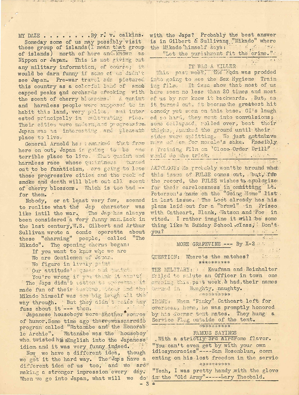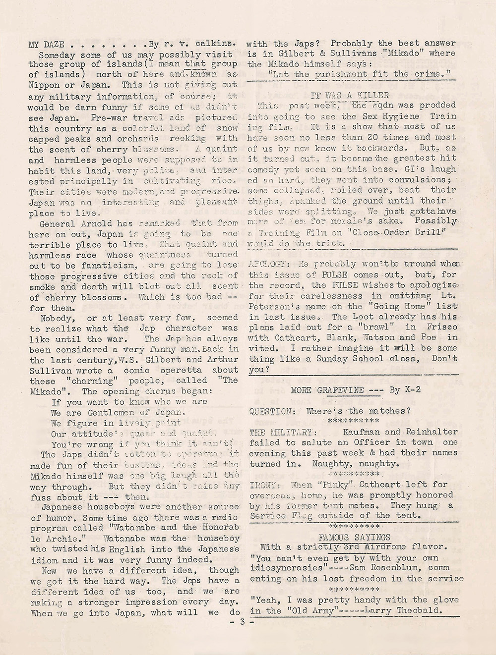 APOLOGY: He probably won’t be around when this issue of the PULSE comes out, but, for the record, the PULSE wishes to apologize for their carelessness in omitting Lt. Peterson’s name on the “Going Home” list in the last issue. The Loot [lieutenant - Ed.] already has his plans laid out for a “brawl” in Frisco with Cathcart, Blank, Watson and Poe invited. I rather imagine it will be something like a Sunday School class, don’t you?