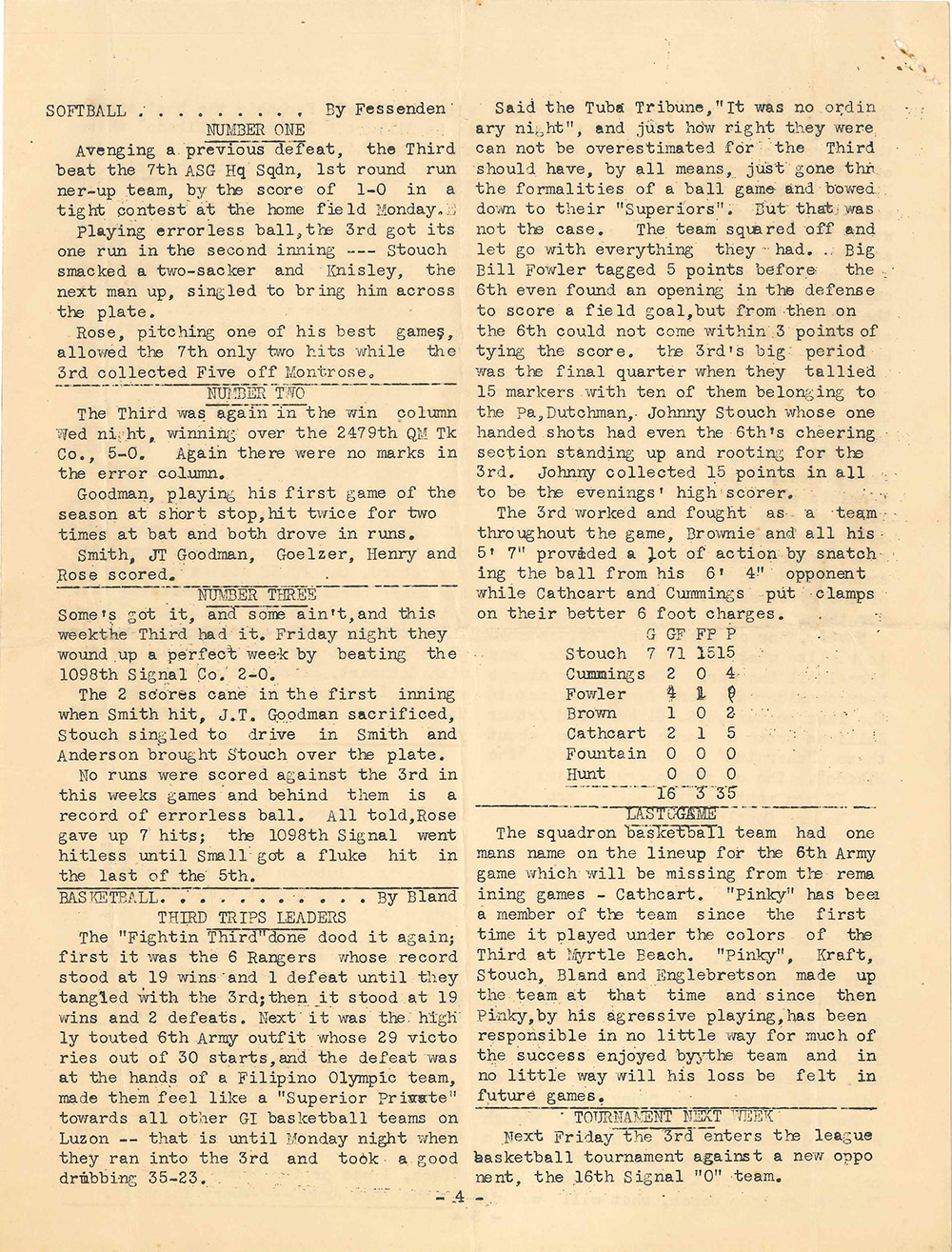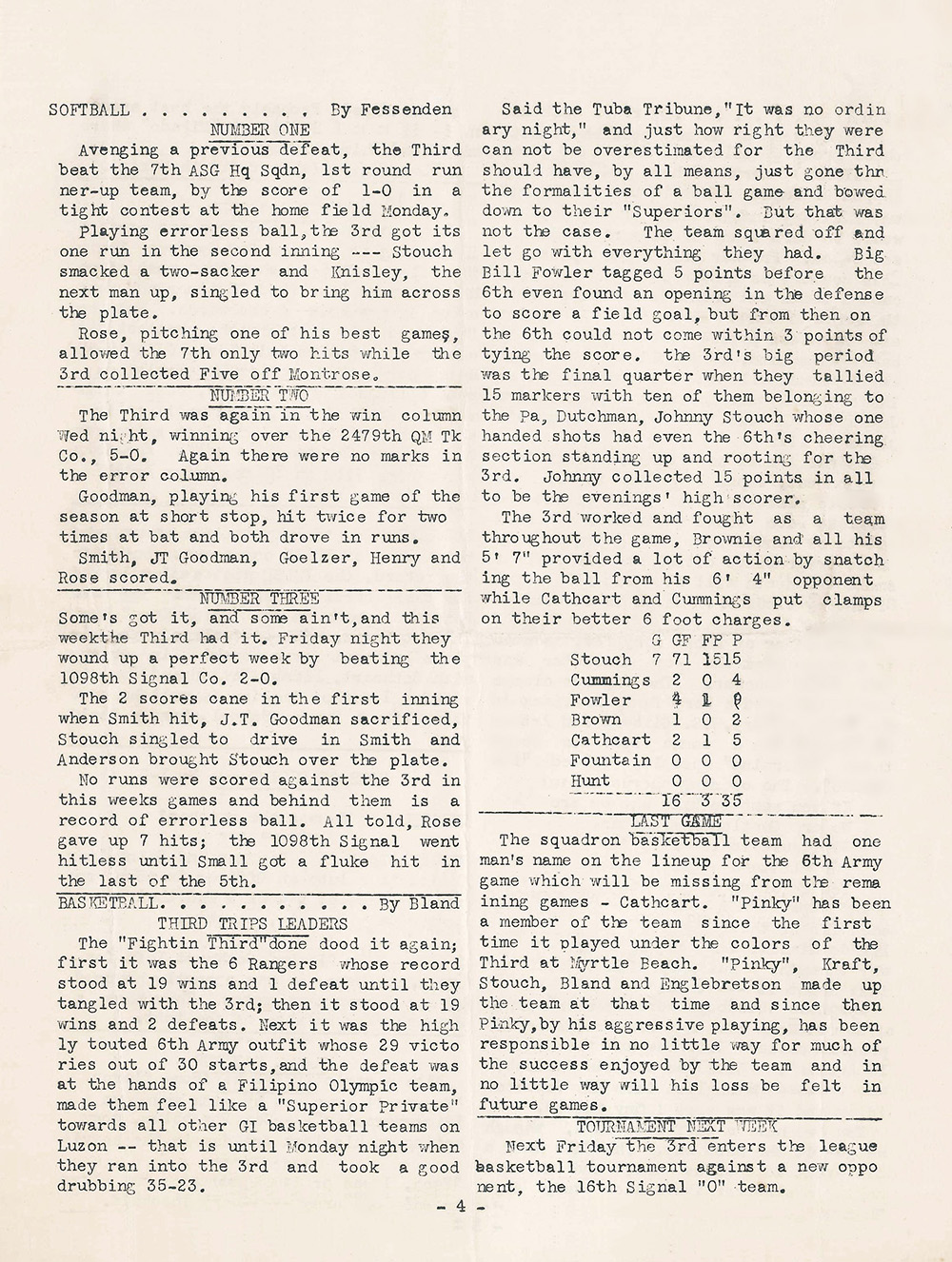 Next Friday the 3rd enters the league basketball tournament against a new opponent, the 16th Signal “O” team [possibly meaning the 16th Signal Operations Battalion - Ed.].
