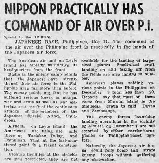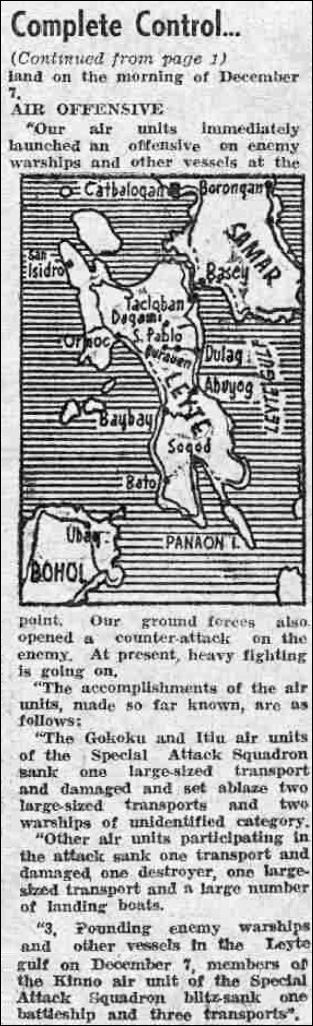 The announcement added that members of the Kinno air unit of the Japanese Army's Special Attack Squadron blitz-sank one battleship and three transports via Leyte Gulf on December 7.