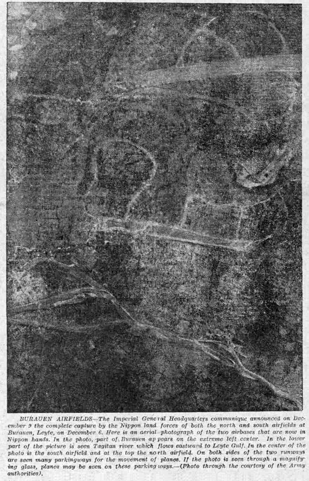 JAPANESE BASE, Philippines, Dec. 9. - Both the north and south airfields at Burauen were completely occupied on the night of December 6 by the Japanese land forces, storming the enemy points in conjunction with the Takatiho air-borne unit, it has been learned here.