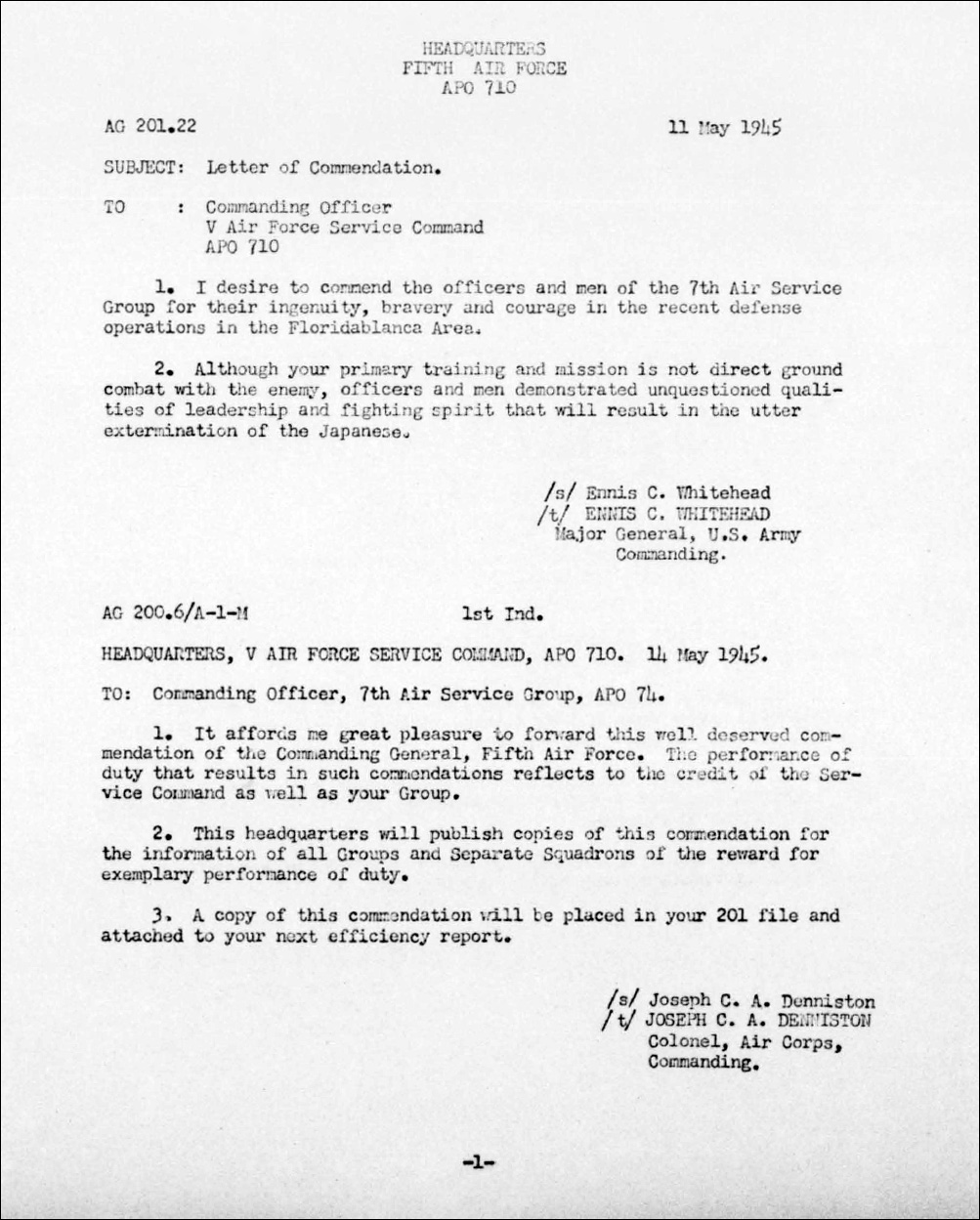 1. I desire to commend the officers and men of the 7th Air Service Group for their ingenuity, bravery and courage in the recent defense operations in the Floridablanca Area.