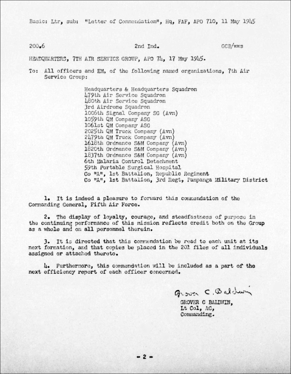 Basic: Ltr, sub: "Letter of Commendation", Hq FAF, APO 710, 11 May 1945