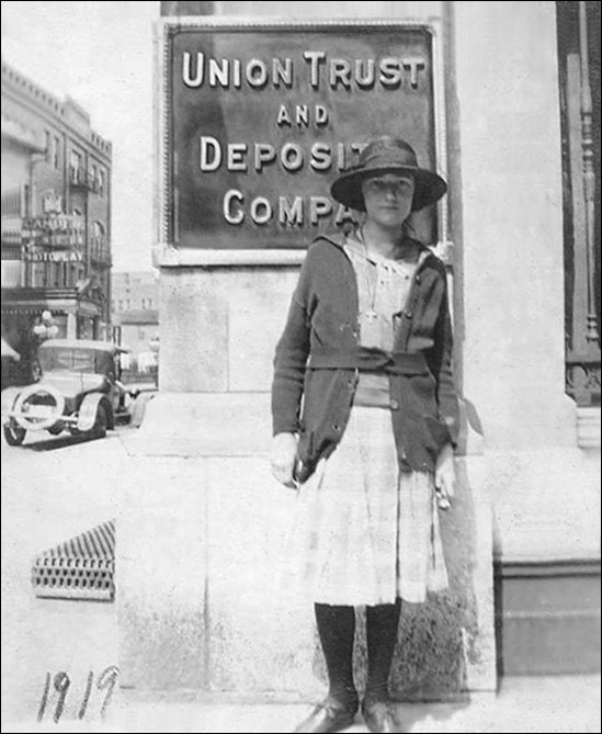 A young woman stands at the northeast corner of Seventh and Market in 1919.
