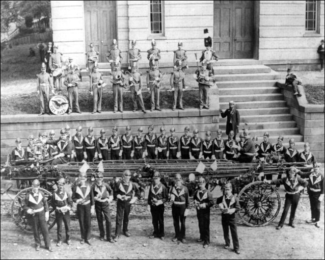 The Parkersburg City Band and what appears to be the volunteer fire department pose