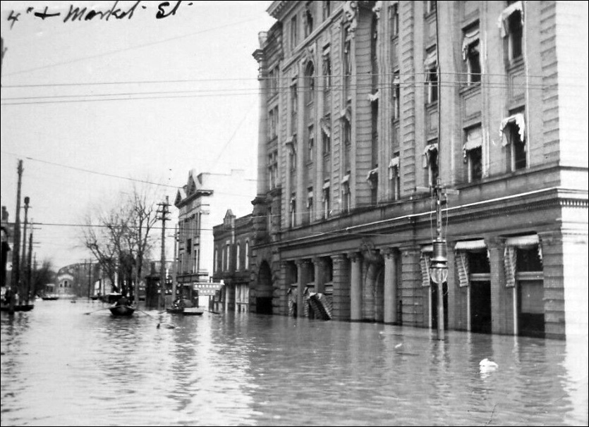 Looking west on Fourth from Market, probably during the 1907 or 1913 flood. The Citizens' National Bank is on the right.