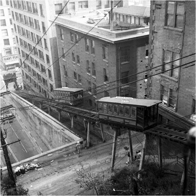 | This 1955 view looking down on Angels Flight, Clay Street, and the Third Street tunnel exaggerates the precipitous drop-off from the funicular to Third Street, which created anxiety in many riders. Angels Flight was used in many films to signal viewers that they had entered an unusual neighborhood. |