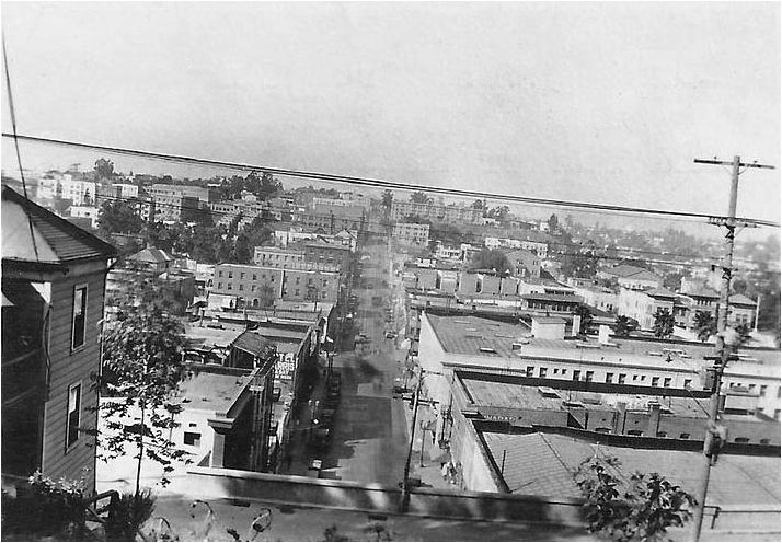 | Looking west on Third Street from the end of Bunker Hill Avenue, above the Third Street Tunnel. The small park just below frame, which had several benches, was used in Joseph Losey's M (1951), This Rebel Breed (1959) and Angel's Flight (1963). |