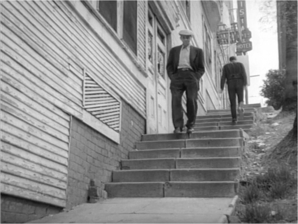 | These steps in Stakeout on Dope Street lead down the hill to Hope Street alongside the Alta Vista Hotel at 255 S. Bunker Hill Avenue. These same steps were used near the beginning of Joseph Losey's M (1951). The Alta Vista was the home of John Fante when he lived on Bunker Hill in the early 1930s. He renamed it the Alta Loma in his 1939 novel, Ask the Dust. |