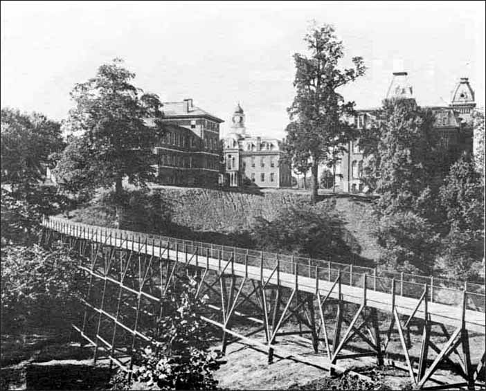 | Looking south across the old bridge toward Woodburn Hall (right), Martin Hall, and Science Hall in the 1890s. Mountaineer Stadium would later, in 1924, be built to the right of the bridge. |