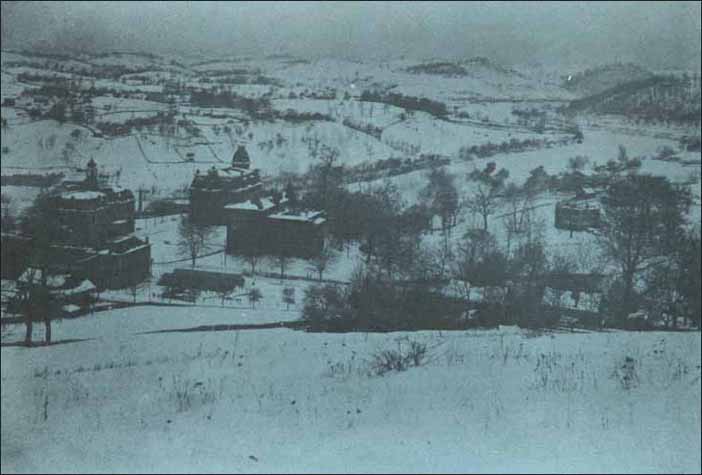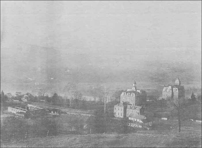 | Looking west toward Martin Hall (left) and the former seminary building circa 1872. Martin Hall, then called the Preparatory Building, was built in 1869. |