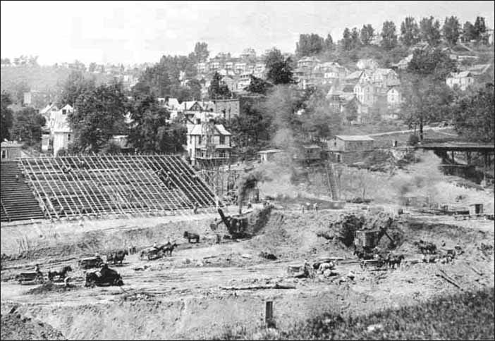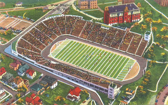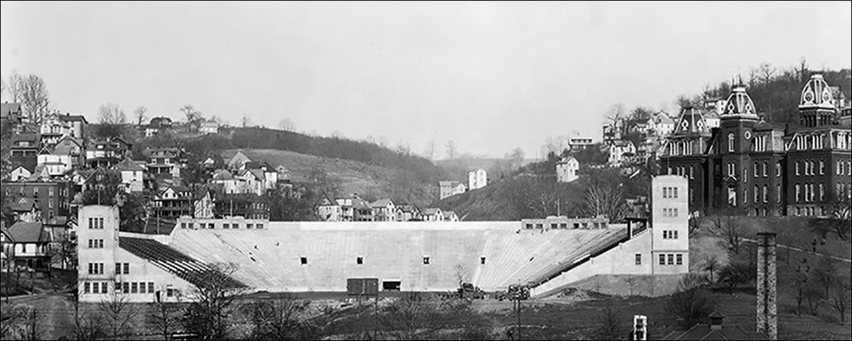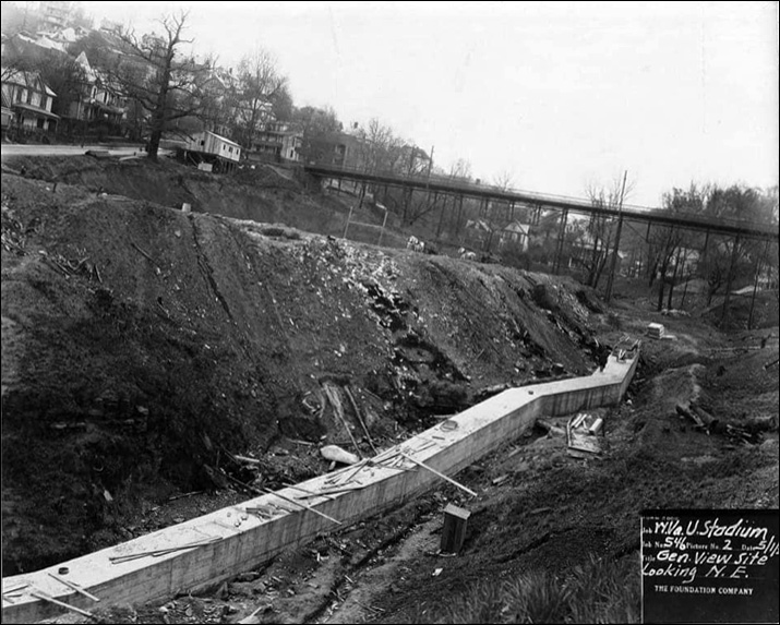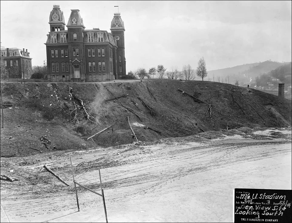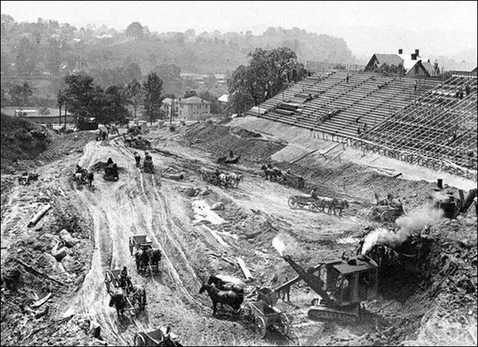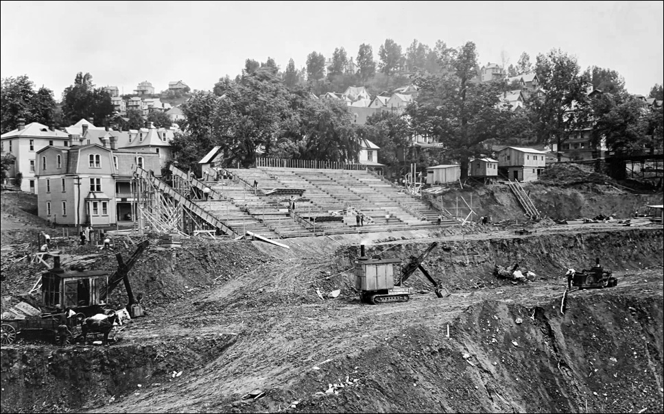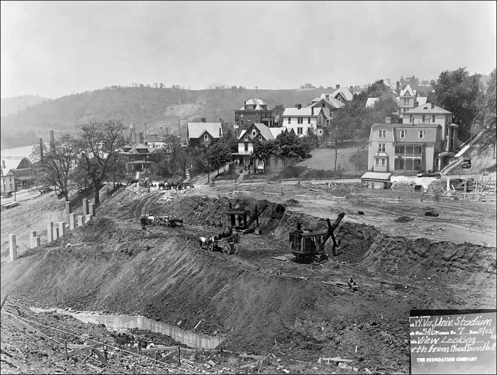| The original WVU stadium is under construction in 1924. Sunnyside is in the background. |