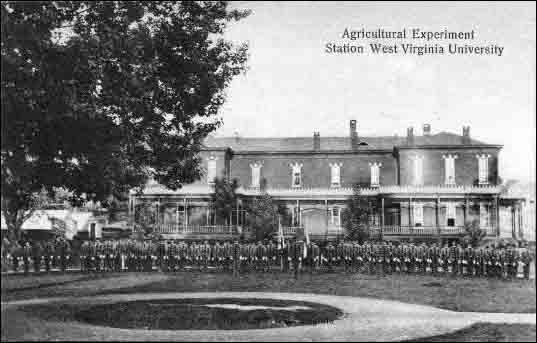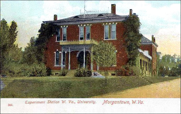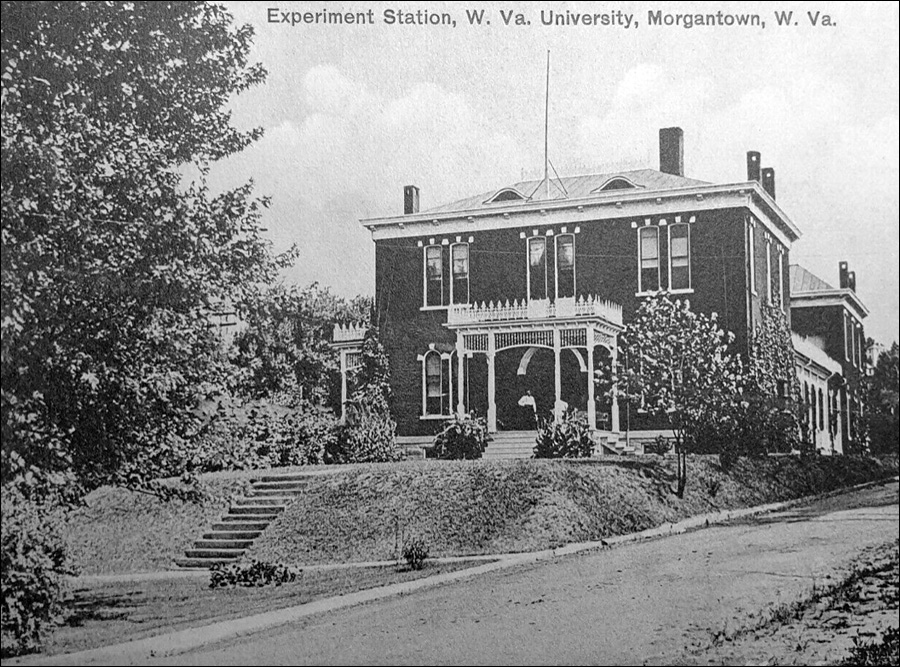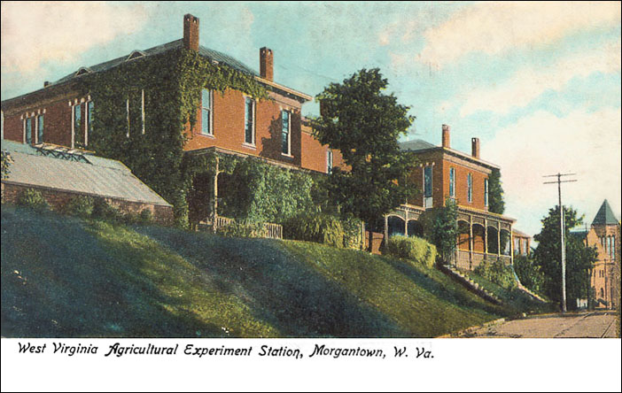 | Looking at the Agricultural Experimental Station from University Avenue at the turn of the century. It would later be replaced by Oglebay Hall. The building to the right is the original WVU Library. It later became Stewart Hall. |