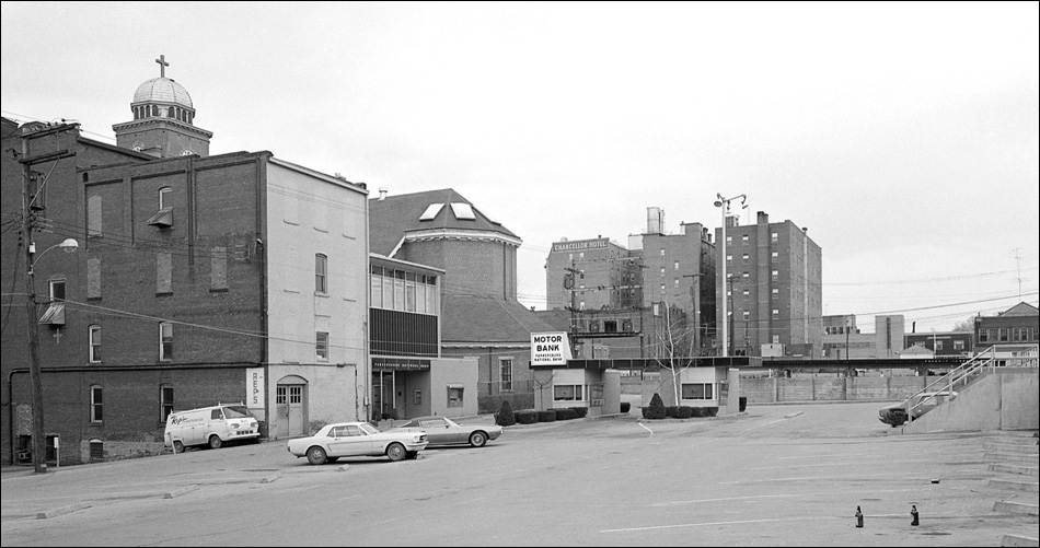 Near the corner of Avery and Fifth, looking northwest across the parking lot toward St. Xavier in 1972.